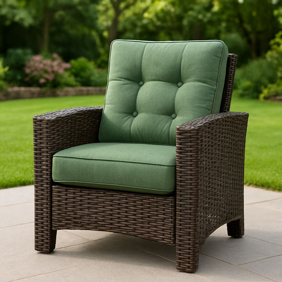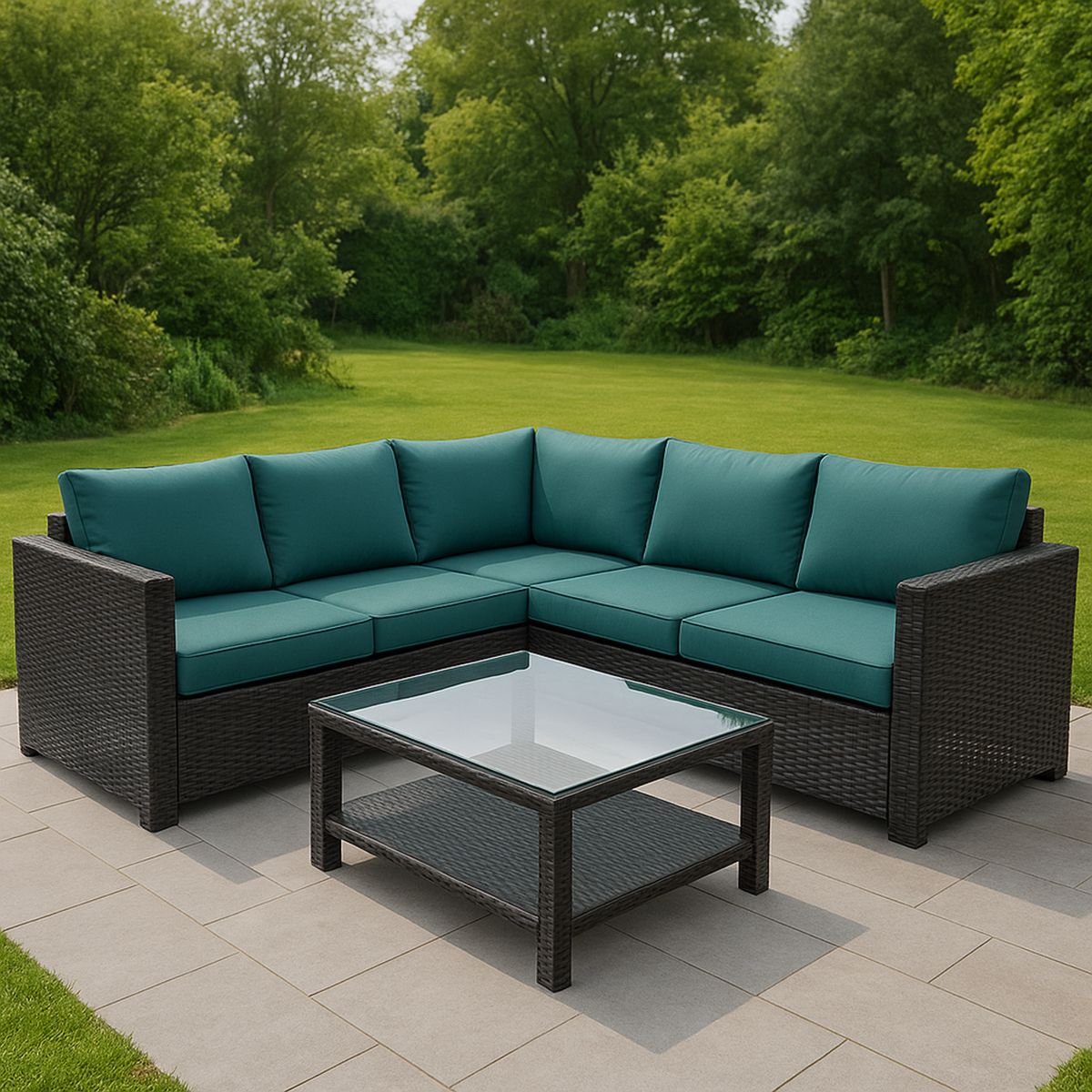 Anyag: PE rattan, acél váz, poliészter párnák, 5 mm-es edzett üveg